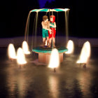 A whimsical scene at night featuring two animated children under a colorful umbrella, playfully standing in a fountain surrounded by illuminated water jets, creating a magical atmosphere.