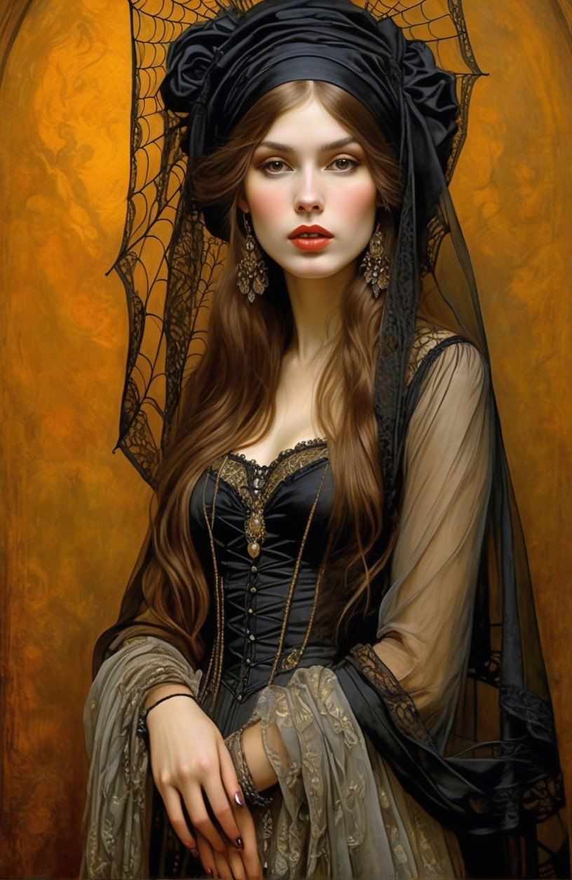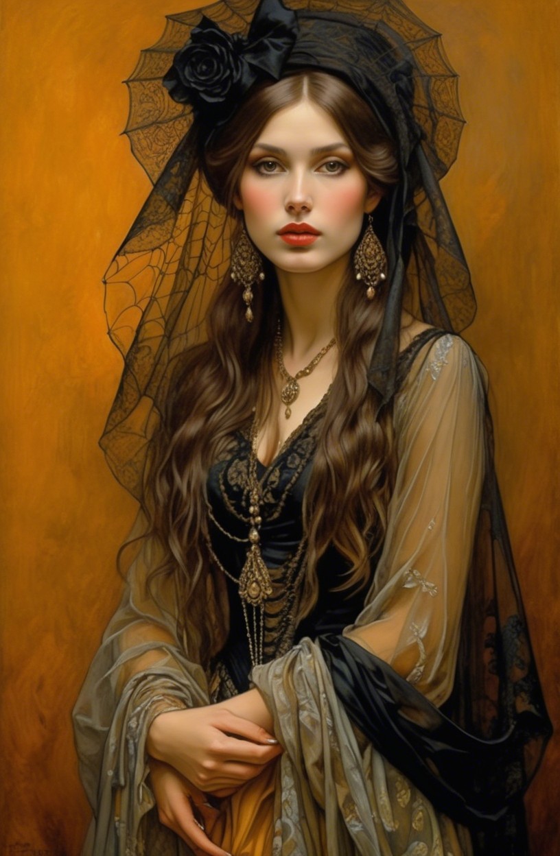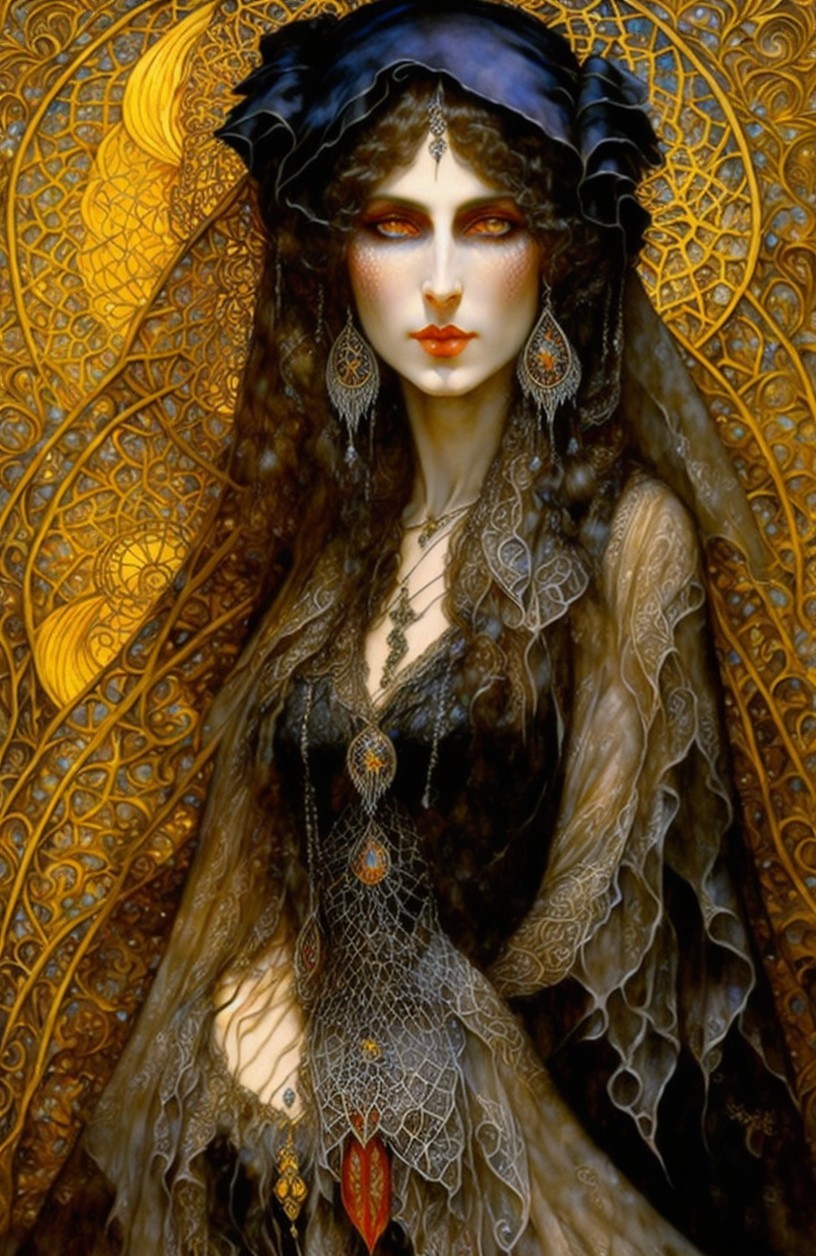 A mysterious young woman in a black gown adorned with lace and intricate jewelry. Her long hair cascades down, framed by a delicate veil, set against a golden, web-like background.