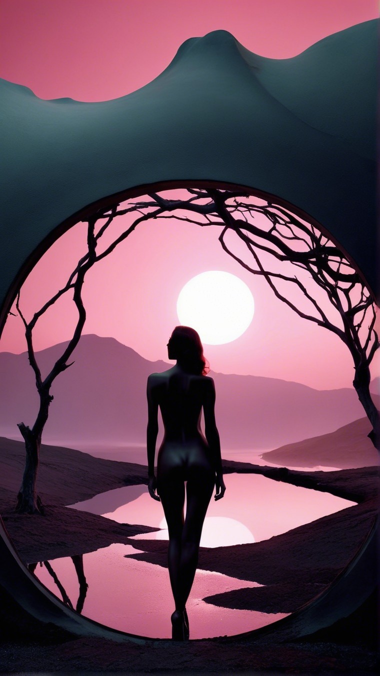 A silhouette of a figure stands gracefully inside a glowing pink orb, surrounded by intricate, flowing designs, creating a striking contrast against the soft background and ethereal atmosphere.