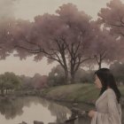 A serene landscape painting features two winding roads diverging through lush fields, surrounded by dark, moody clouds and silhouetted trees against a soft, muted sky.