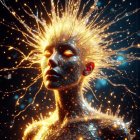 A close-up of a woman with luminous blue eyes, her face intricately adorned with glowing, network-like wires that highlight a blend of beauty and technology in a striking, futuristic design.