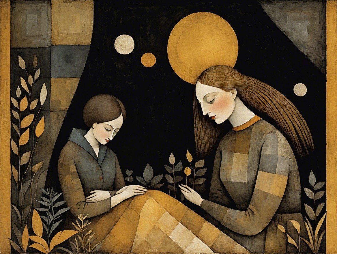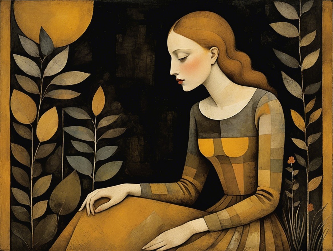 A stylized portrait of a young woman with large, expressive eyes and a serene expression. She's framed by geometric shapes in warm, earthy tones, creating a harmonious contrast.