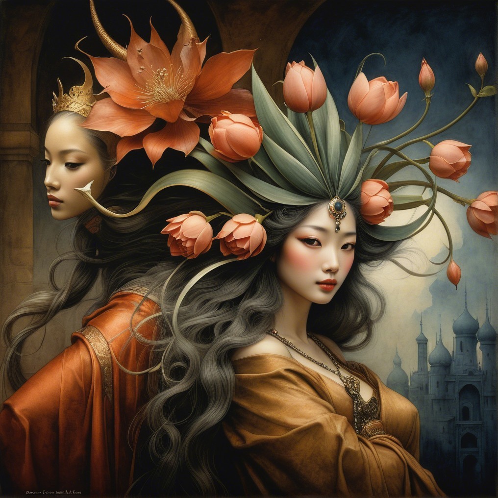 A woman with flowing black hair adorned with vibrant flowers and a golden crown gazes serenely. Butterflies flutter around her, enhancing the ethereal, artistic vibe of the portrait.