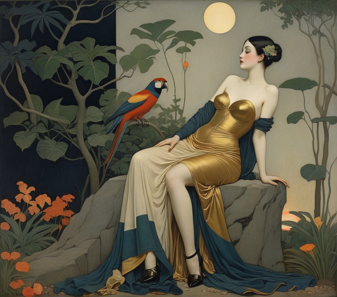 In a serene, dreamlike setting, two elegant women with flowing hair sit amidst lush greenery and vibrant flowers, illuminated by a soft moonlight, exuding an aura of tranquility and beauty.