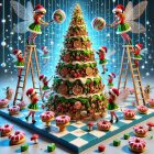 A whimsical scene featuring candy-themed elves joyfully decorating a towering candy tree with colorful sweets and lollipops, set against a sparkling, vibrant background.
