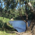 A whimsical scene features a giant green creature with an eye and claws beside a blue, round structure resembling a house. Surrounded by fantastical trees, the night sky sparkles overhead.