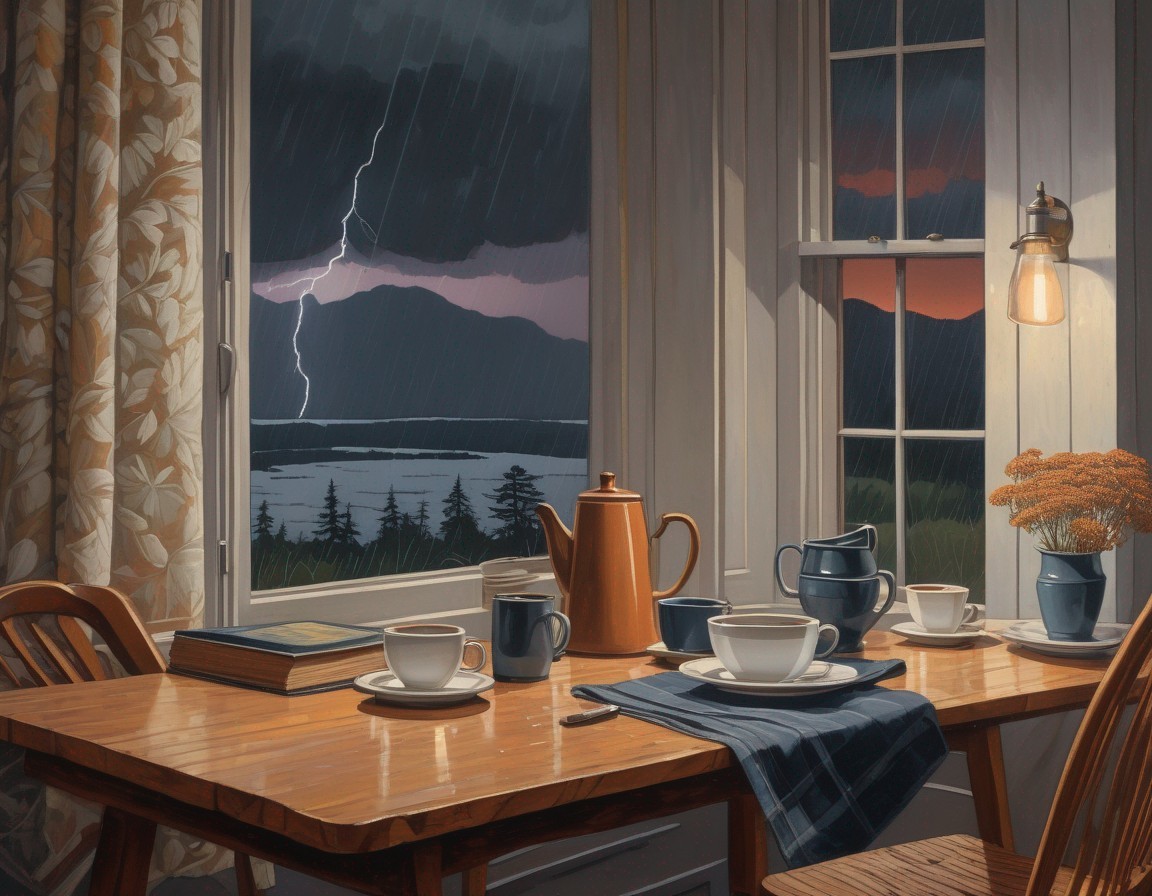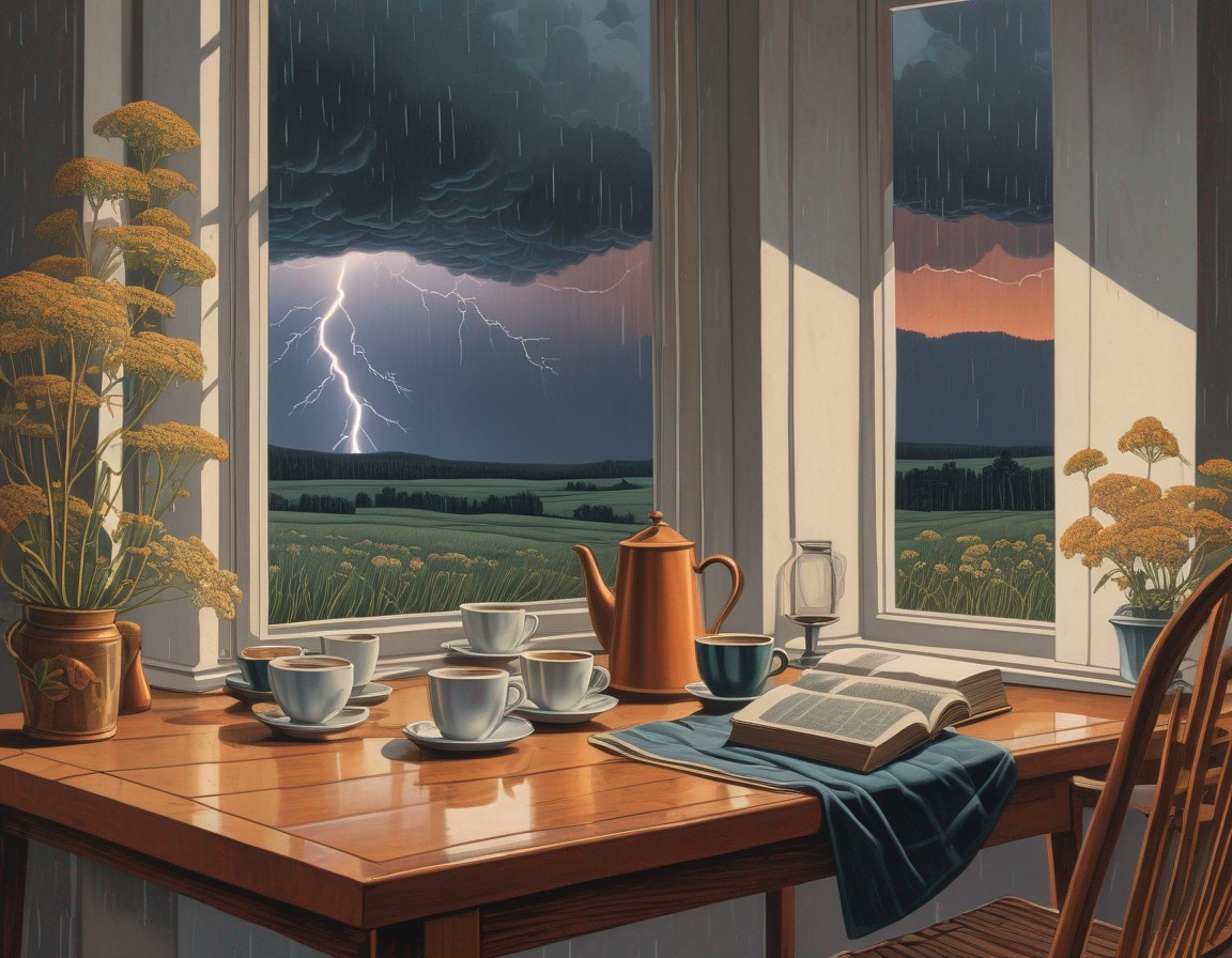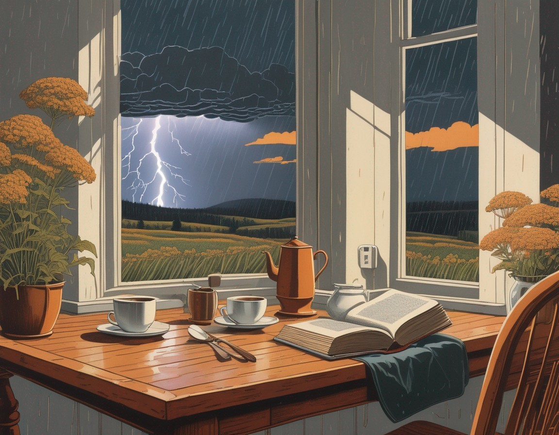 a vintage linocut, faded colors, Muted color, There are book and coffee cups and someones glasses on the table , love of autumn a scene viewed in the Adirondacks in the morning . Intricate linocut art of queen anne's lace in the field, ominous storm clouds, pouring rain, and lightning in the distant sky at sunrise, in the style of david ligare, light gray and dark emerald, kay sage, raw figuration,, trompe l'oeil compositions, rusticcore , .. surreal, beautiful,