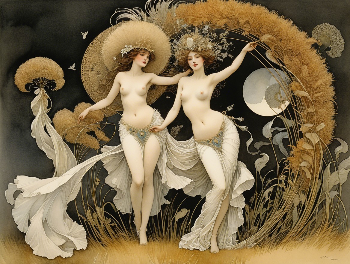 A graceful figure in a shimmering outfit dances amidst flowing golden grasses and wisps of dandelion seeds, evoking a sense of nature's beauty and elegance against a dark backdrop.