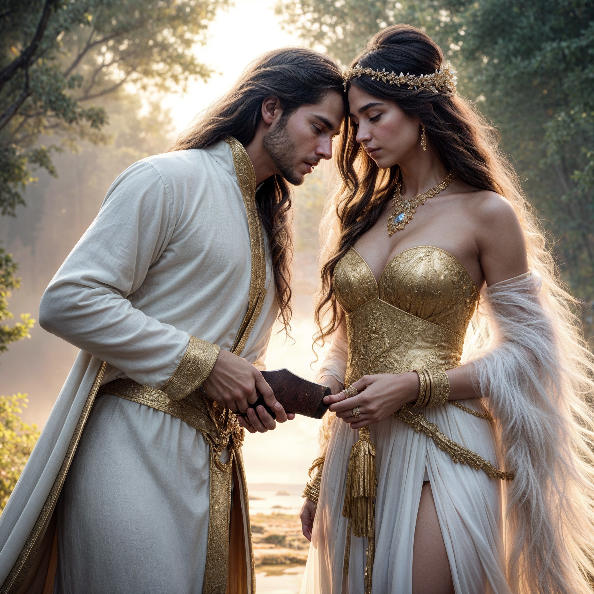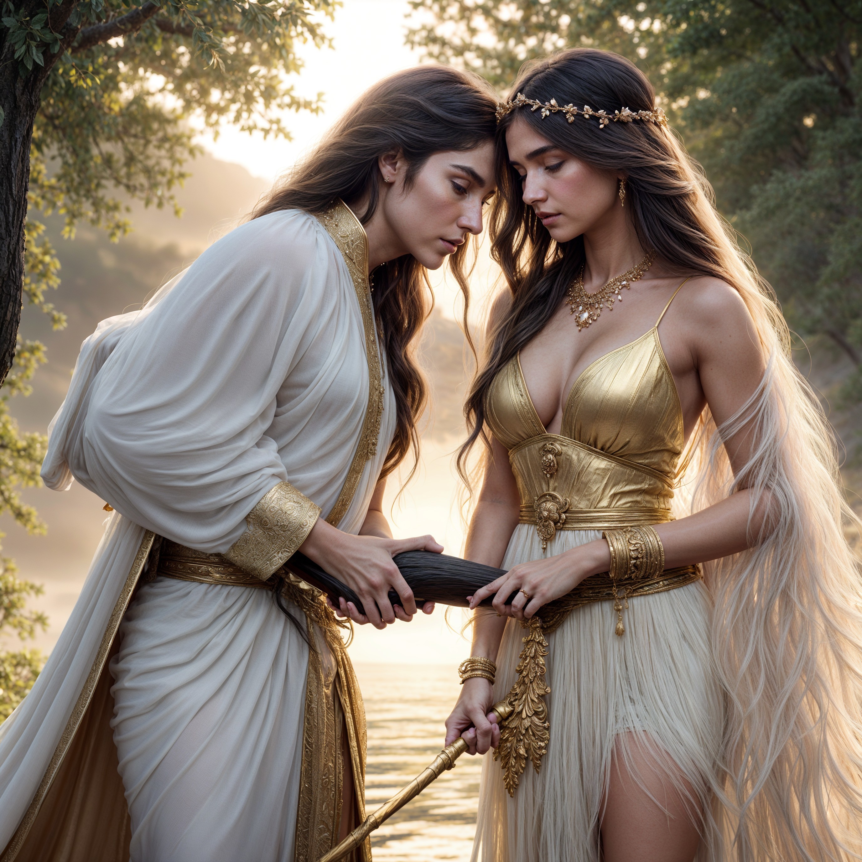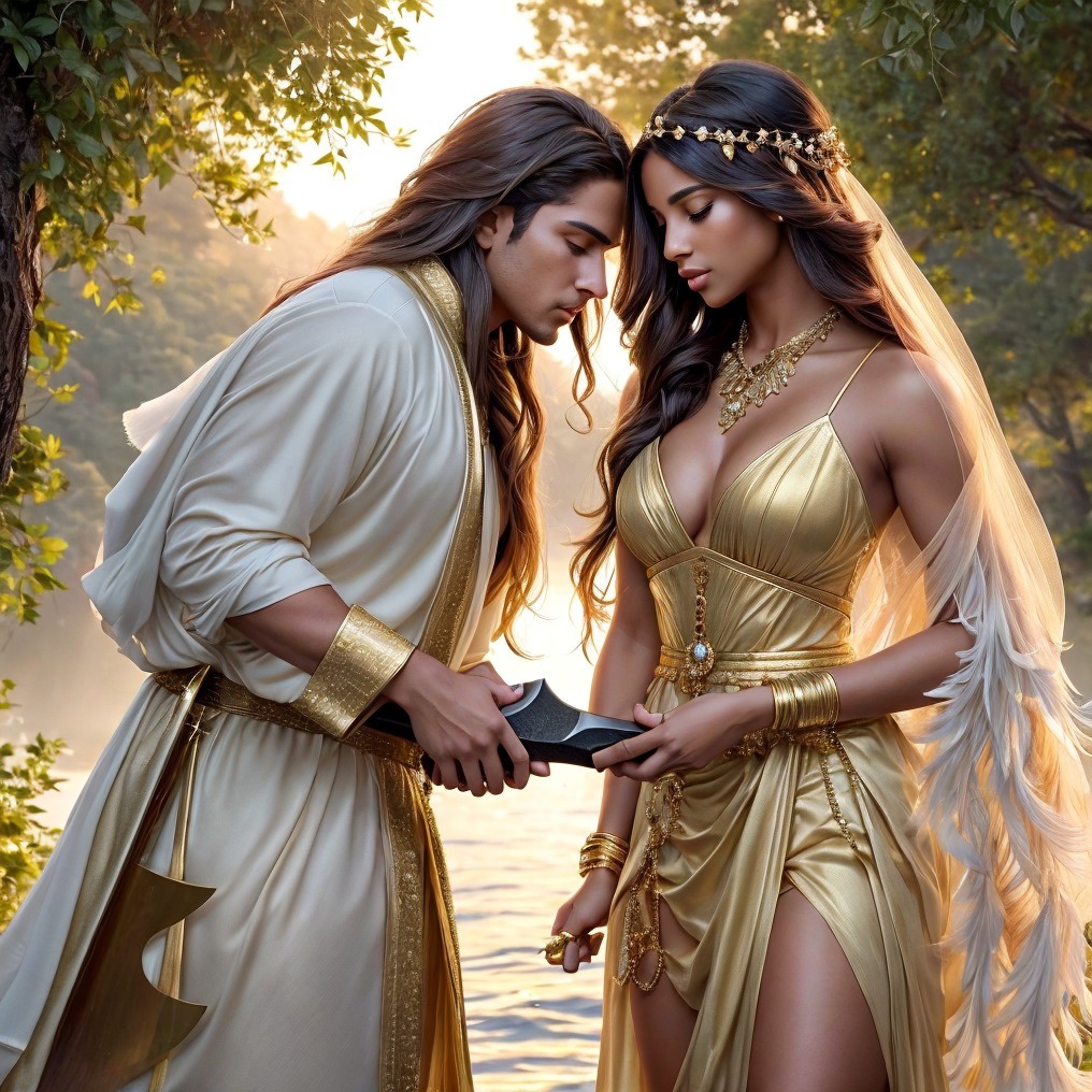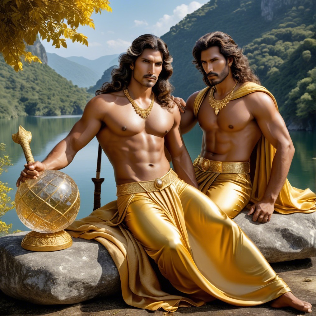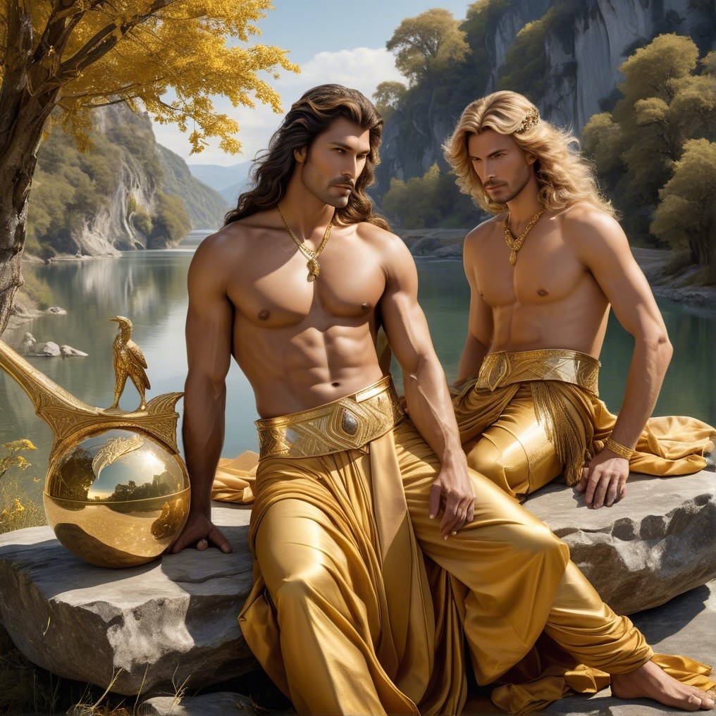Two muscular men in golden attire sit by a river, exuding a regal presence. They wear elaborate jewelry, and their long hair flows elegantly. The lush landscape enhances the mythical atmosphere.