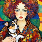 A colorful portrait features a girl with vibrant, curly hair holding a small dog. The background is filled with abstract shapes and bold colors, creating a striking and artistic atmosphere.
