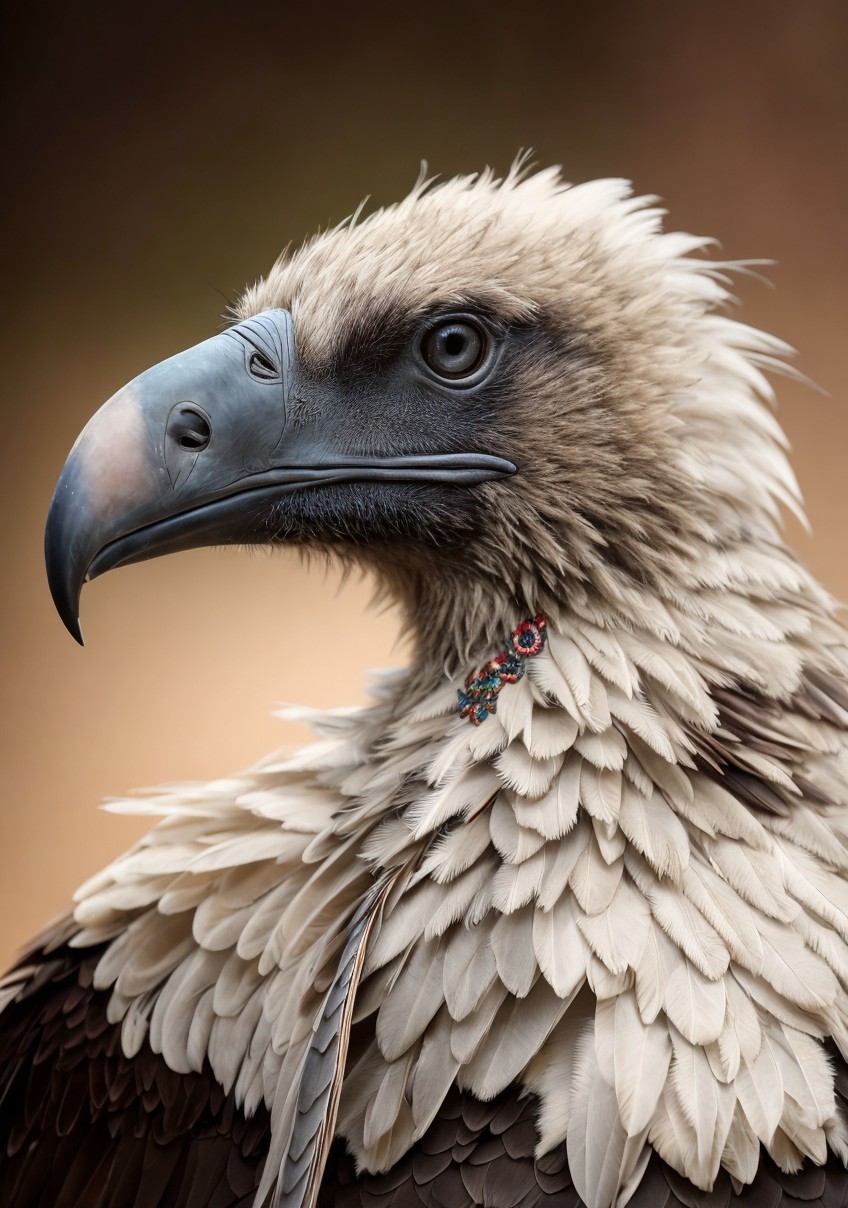 Portrait of a vulture adorned with colorful beads, showcasing intricate feather details against a soft brown background.