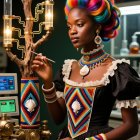 A woman in an intricately designed black gown adorned with floral patterns poses beside a decorative gold dragon. Her vibrant floral headpiece and elegant earrings enhance her regal appearance.