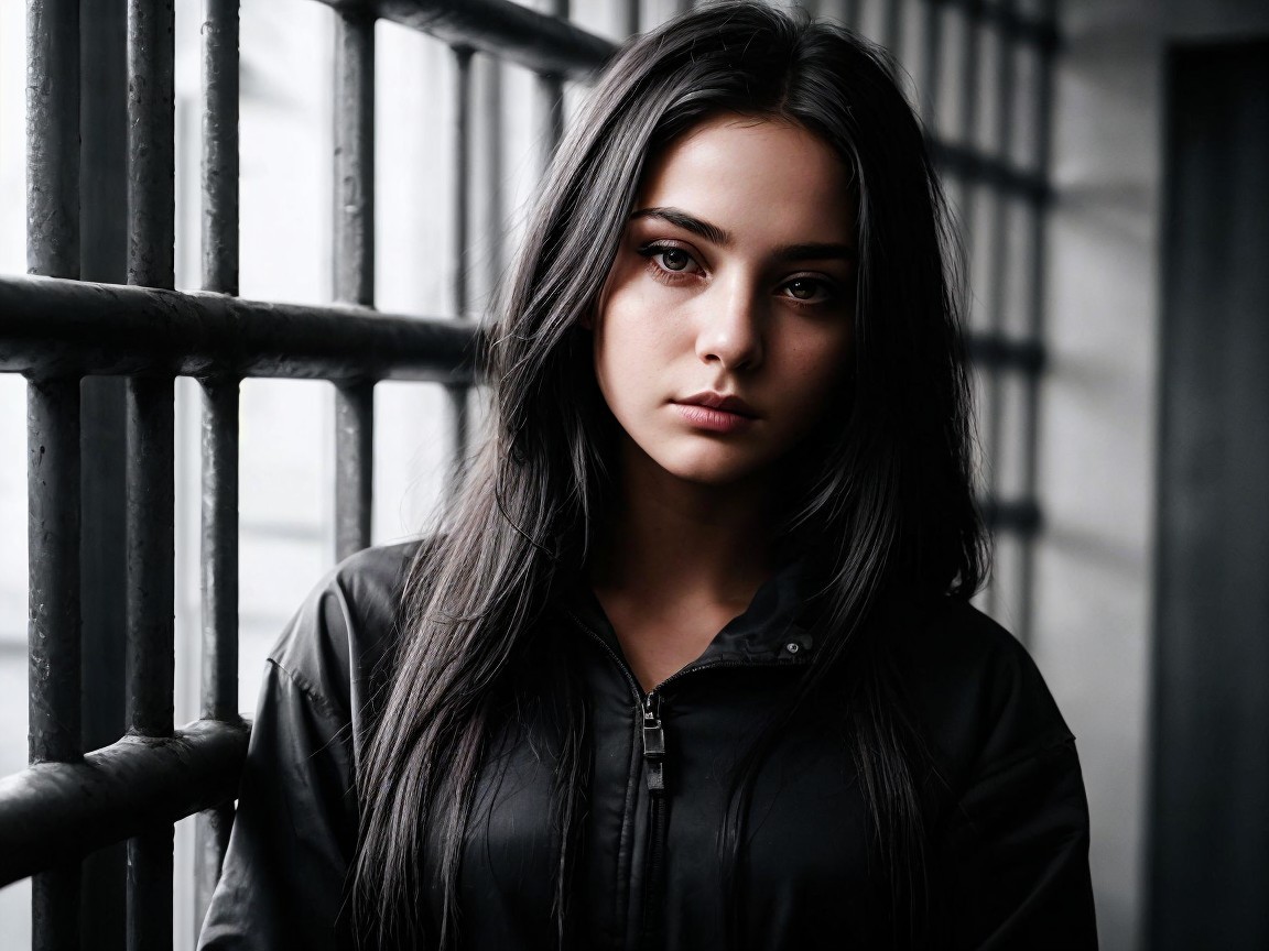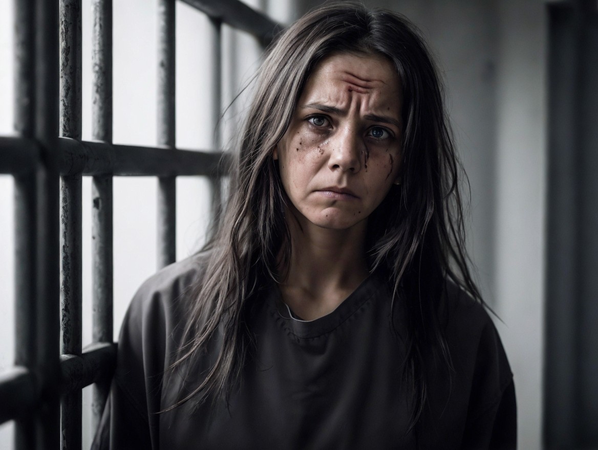 A woman with disheveled hair holds a vulnerable and defiant expression, standing beside gray prison bars. Her tired eyes suggest a troubled past, set against a stark, dimly lit backdrop.