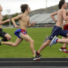 A group of male athletes races on a track, showcasing their determination and speed. Each runner wears different vibrant uniforms, emphasizing the competitive spirit of the event.