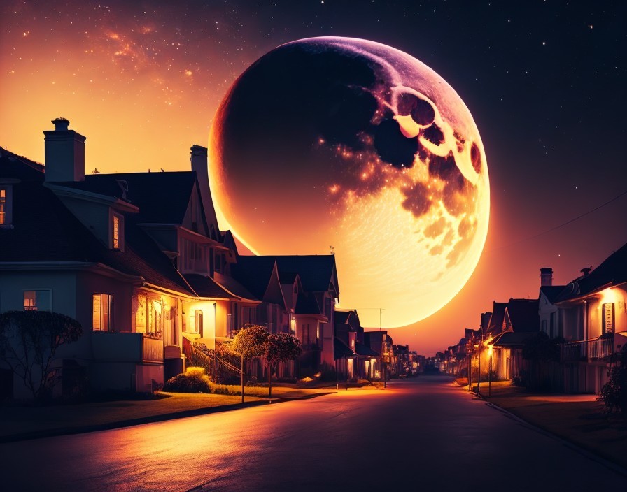 A surreal scene of a suburban street at night under a huge, looming moon occupying most of the starlit sky.