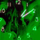 A vibrant clock glows in green against a dark background, surrounded by splashes of luminous paint, creating a dynamic and striking visual effect that captures time in a creative way.