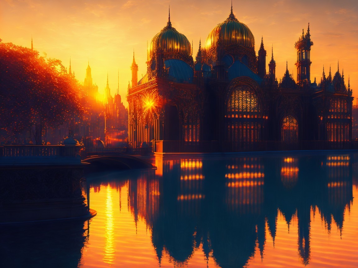 A stunning sunset casts a golden glow over a grand, ornate building with domes and intricate details, reflected in calm waters, surrounded by silhouetted cityscapes and vibrant foliage.