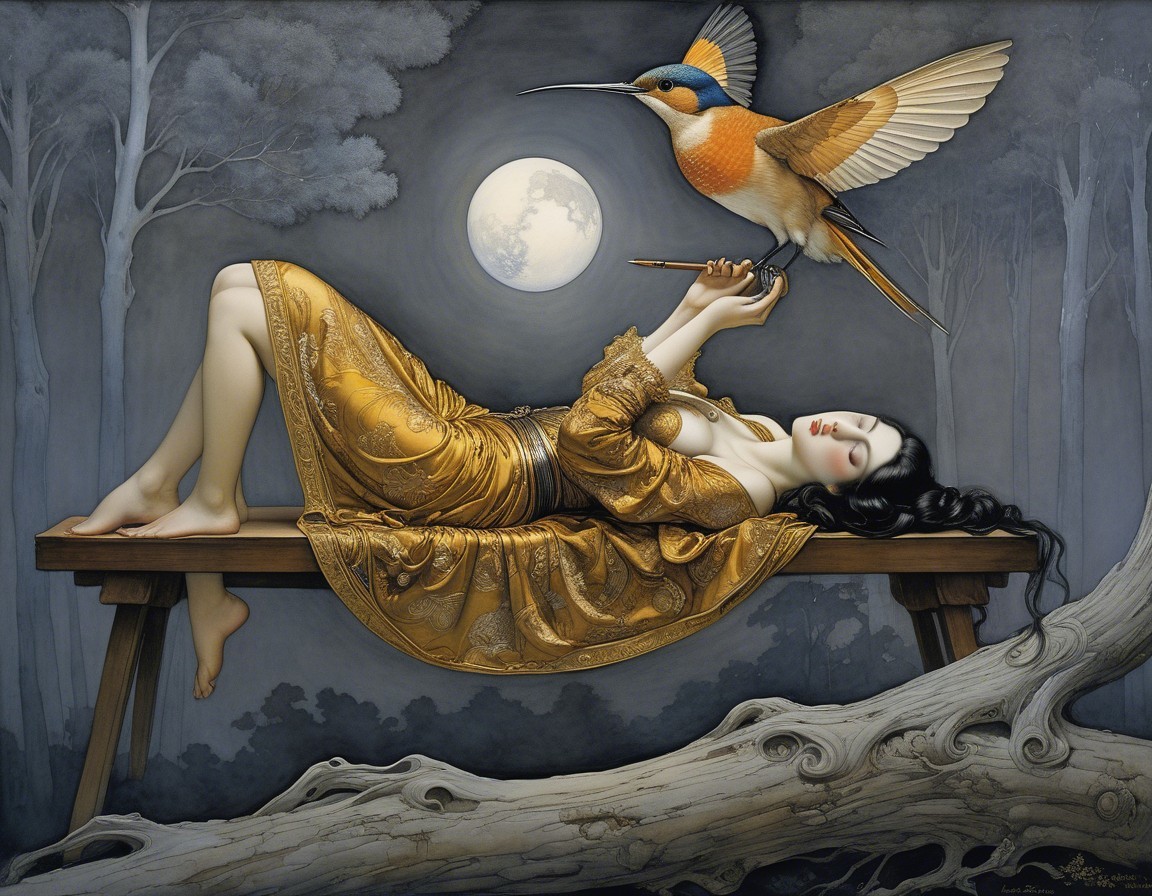 A captivating fairy in a shimmering golden gown lounges on a bench by a serene moonlit pond, adorned with flowers and delicate butterfly wings, exuding an enchanting, mystical aura.