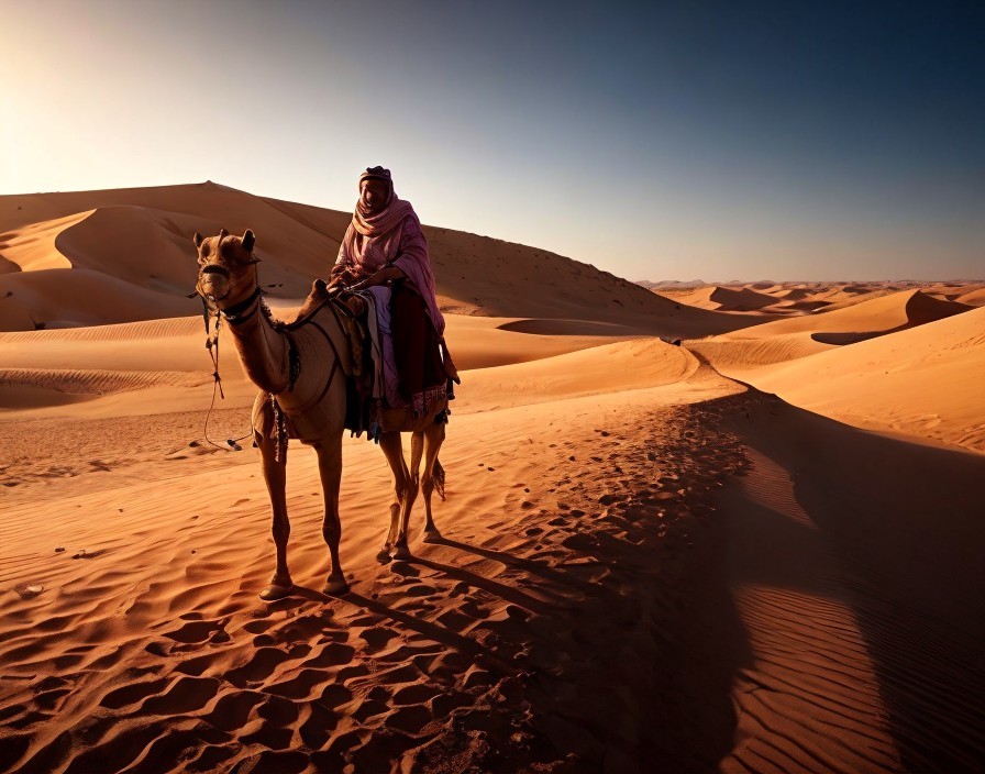 A person riding a camel across a desert with rolling sand dunes highlighted by a warm, setting sun.