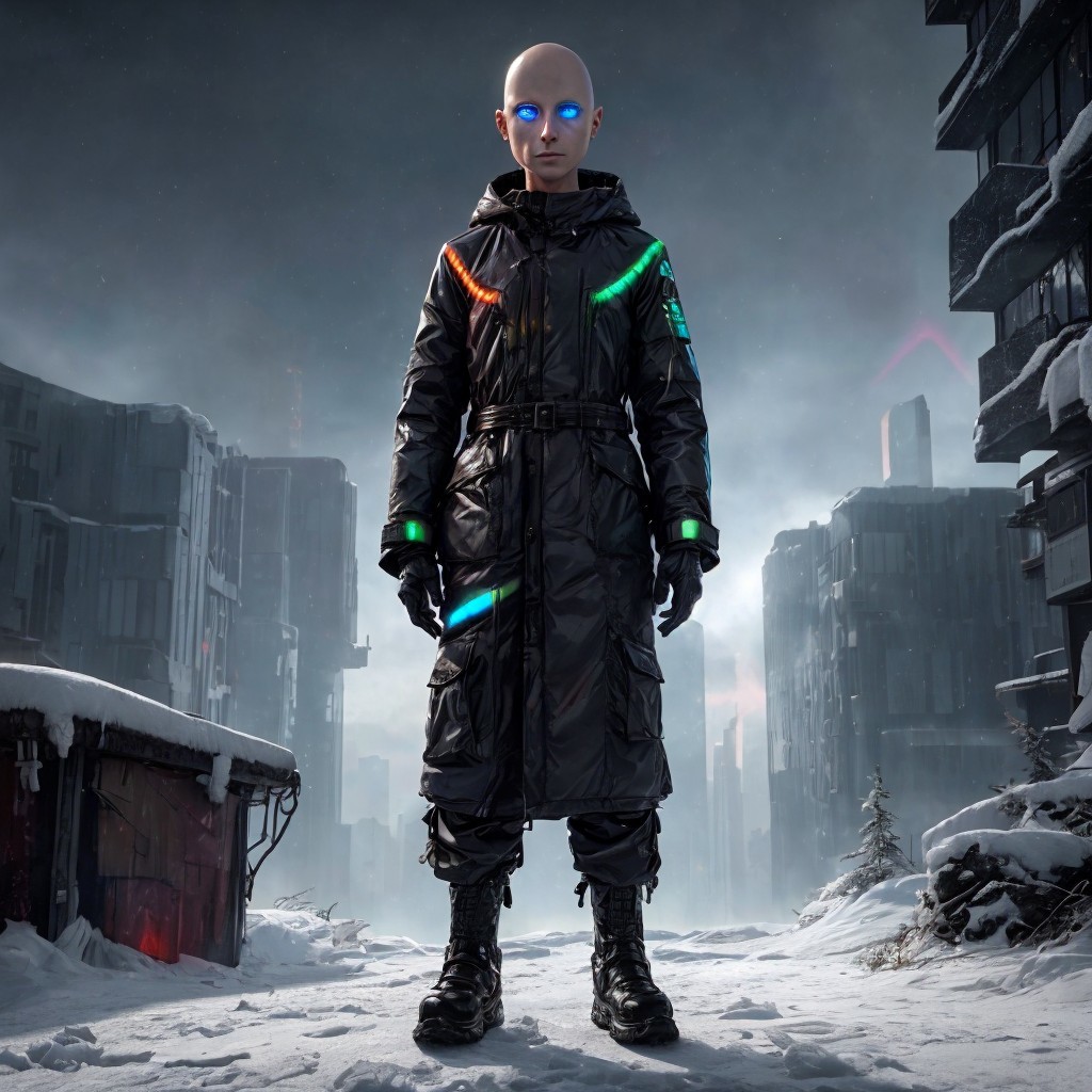 A vaguely humanoid holographic being visits an abandoned metropolis on a cold, distant planet.
