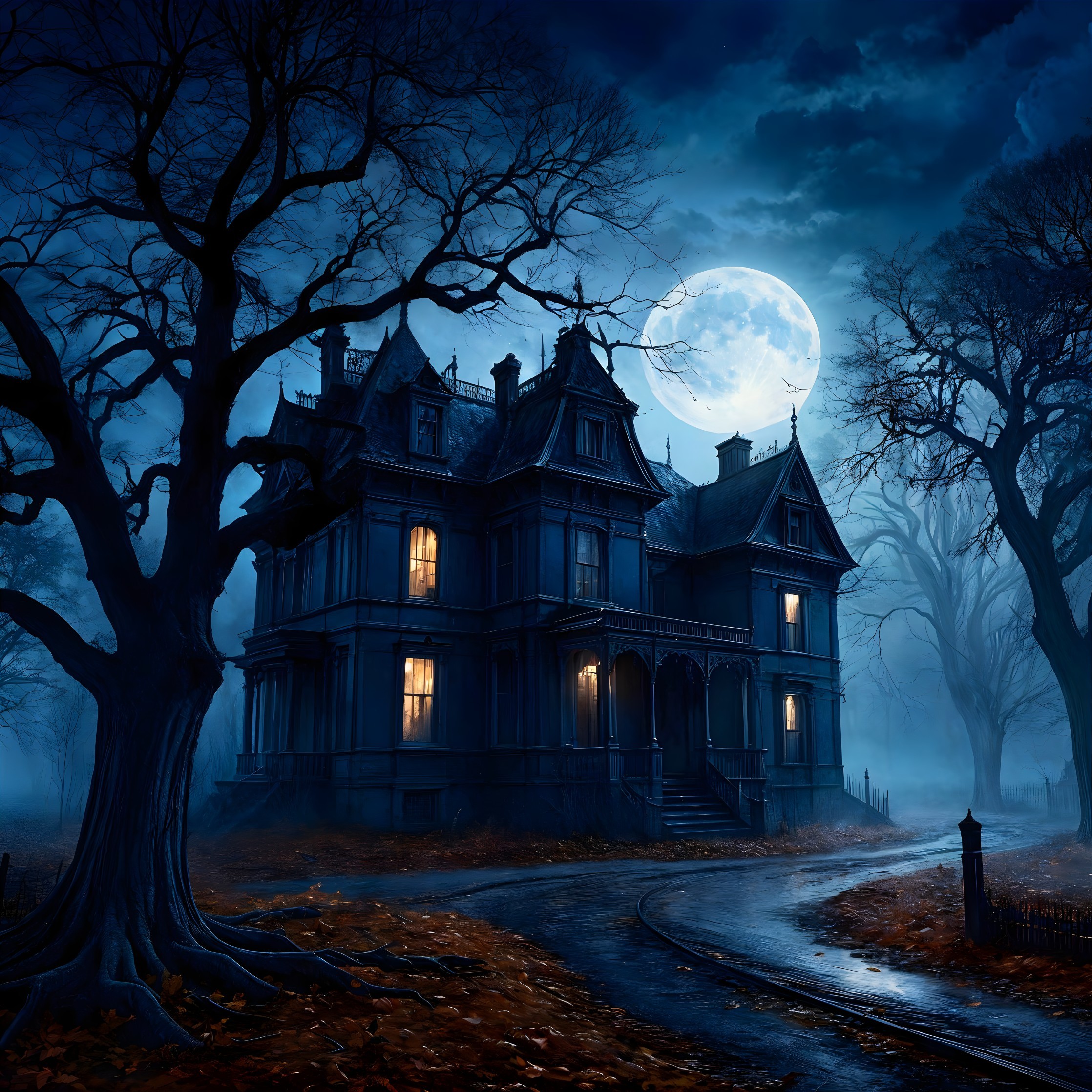 A hauntingly beautiful digital painting of a Victorian haunted house, shrouded in deep blue fog and illuminated by moonlight. Twisted trees and fallen leaves create a mysterious, captivating atmosphere.