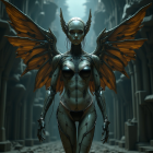 A futuristic, humanoid figure with metallic features and ornate orange butterfly wings stands confidently in a dimly lit, industrial setting, exuding a blend of beauty and strength.