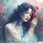 A serene young woman with flowing blue hair gently holds a cluster of pink flowers, surrounded by delicate blossoms against a soft, ethereal background. Her expression is tranquil and wistful.