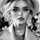 A young woman with soft features and captivating blue eyes stands among flowers. She wears a light-colored hat and a scarf, exuding a serene, timeless charm in a monochromatic style.