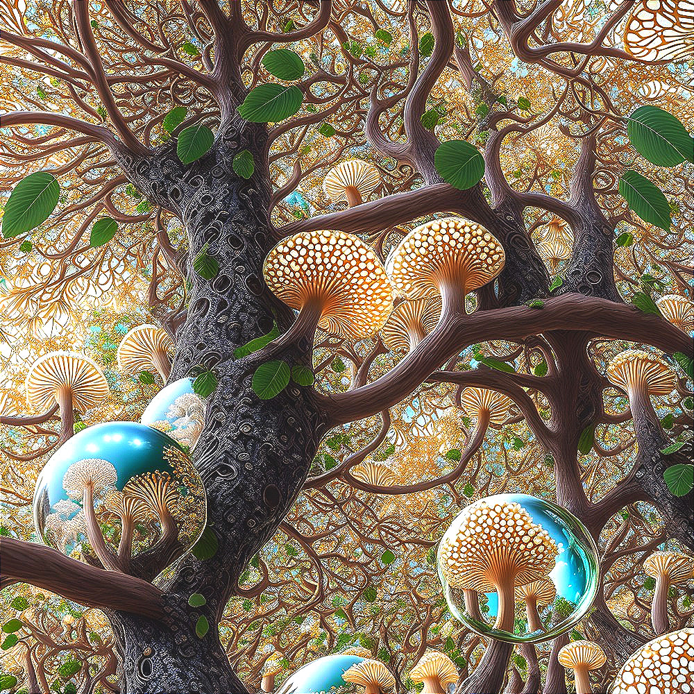 Illustration of whimsical trees with twisting branches and spherical, glowing mushrooms intertwined in an intricate, fantasy pattern.