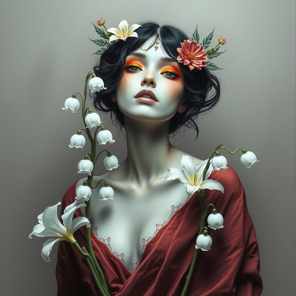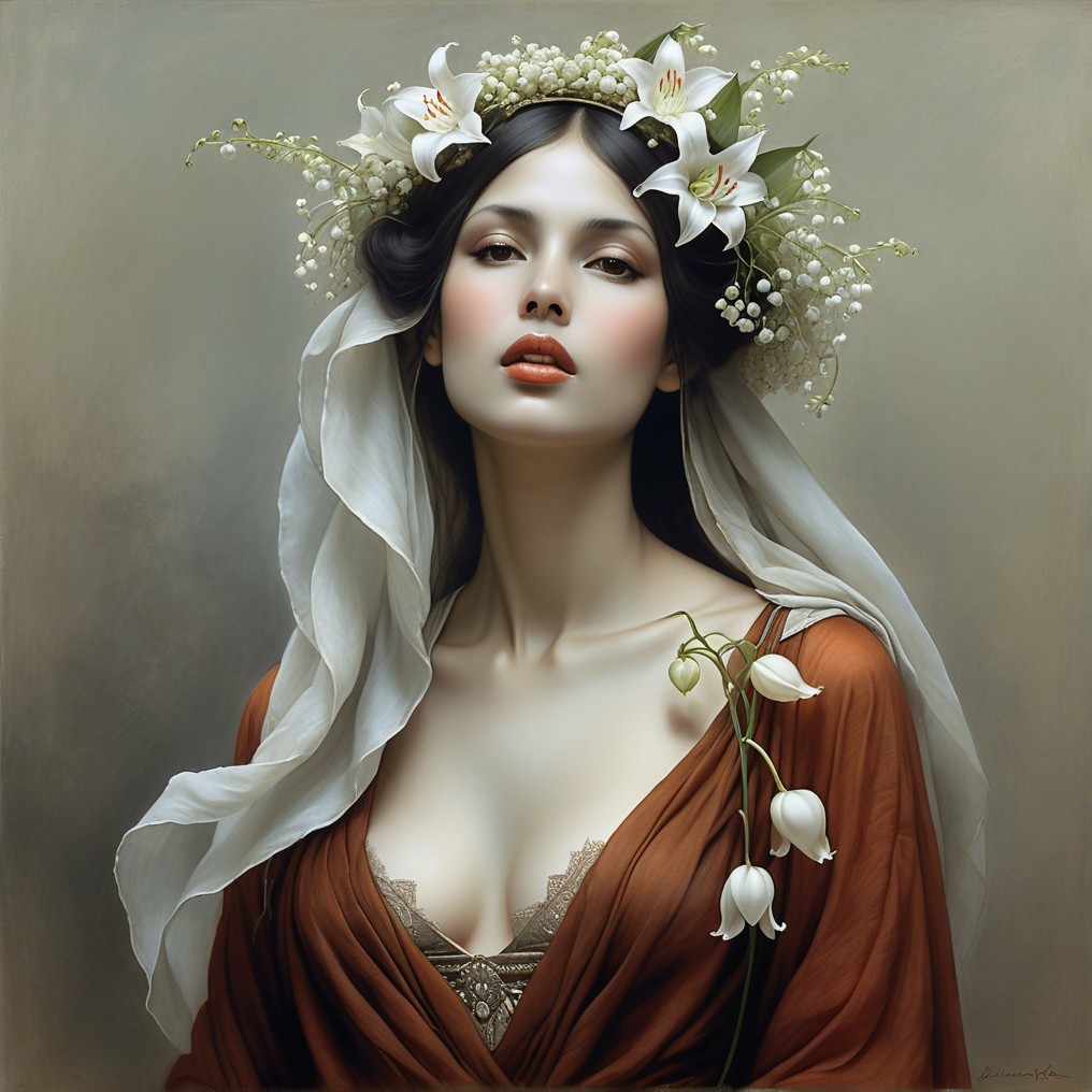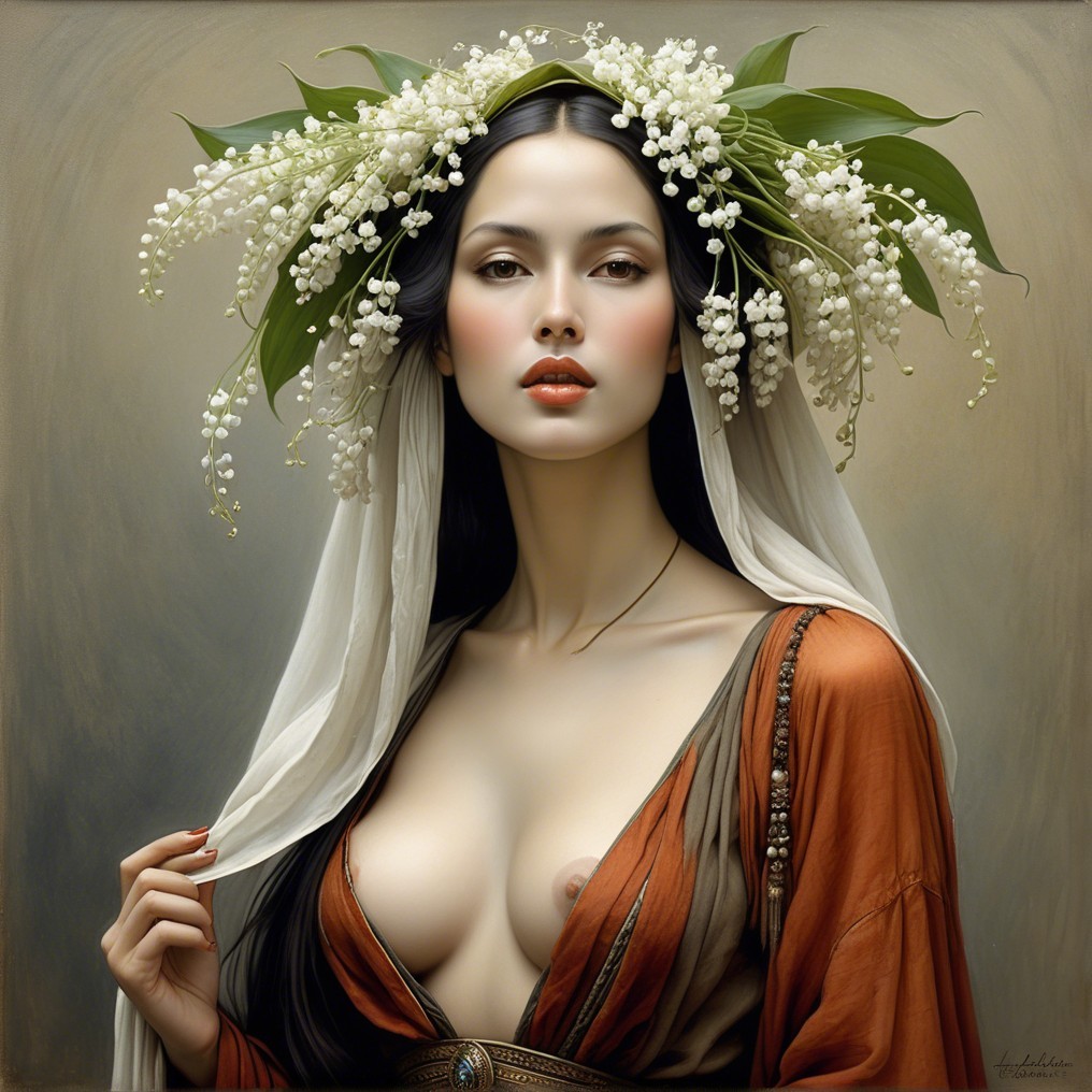 A woman with an ornate floral headdress and a classic orange draped garment gazes serenely forward.