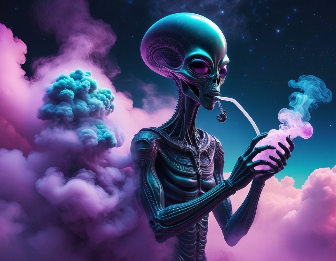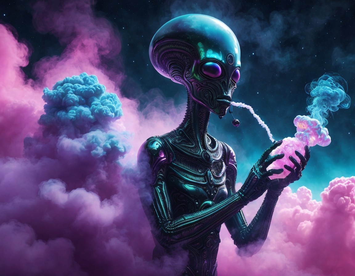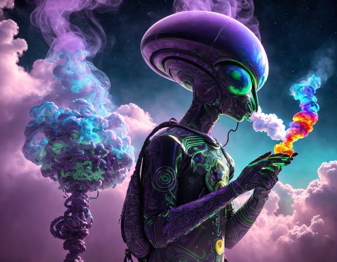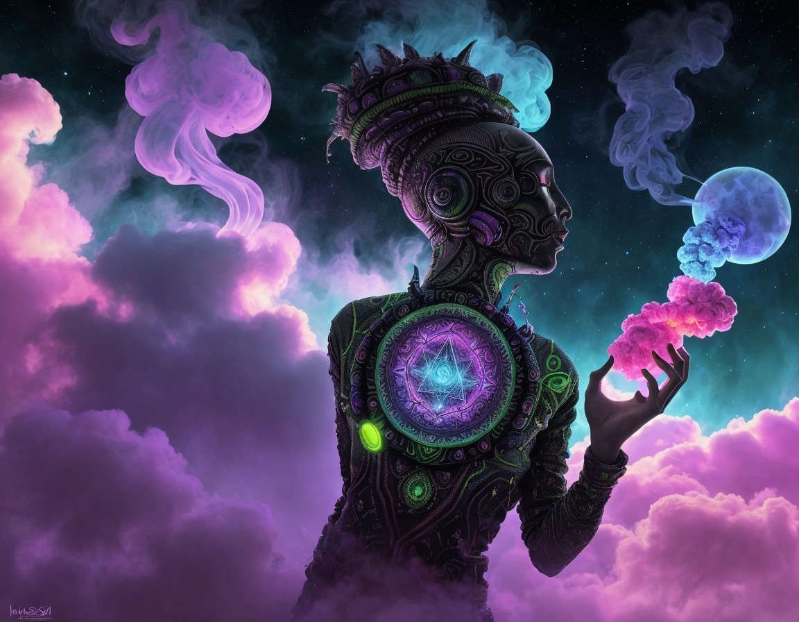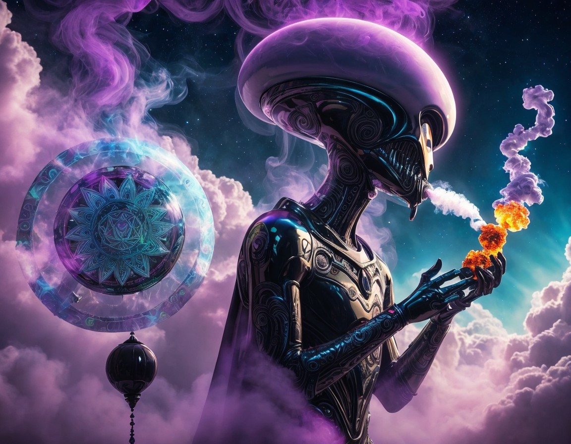 A mystical robot with a glowing chest compass surrounded by ethereal clouds and colorful nebulas in a fantasy-themed cosmic setting.