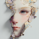 The image features a delicate face emerging from fragmented, peeling layers, blending surrealism and beauty. Soft colors and intricate details evoke a sense of transformation and vulnerability.