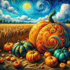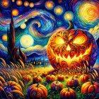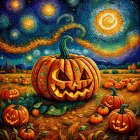 A vibrant, swirling night sky illuminated by stars and a glowing sun, with a beautifully carved pumpkin in the foreground, surrounded by pumpkins in a whimsical, Halloween-themed landscape.