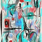 The image features an abstract composition with vibrant splashes of red, blue, and black. Curved lines and geometric shapes create a dynamic interplay, evoking energy and movement.