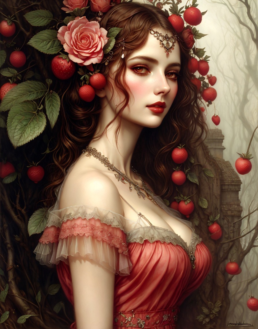 A digital painting of a woman with a floral headpiece and a red dress amidst a backdrop of green foliage and berries.