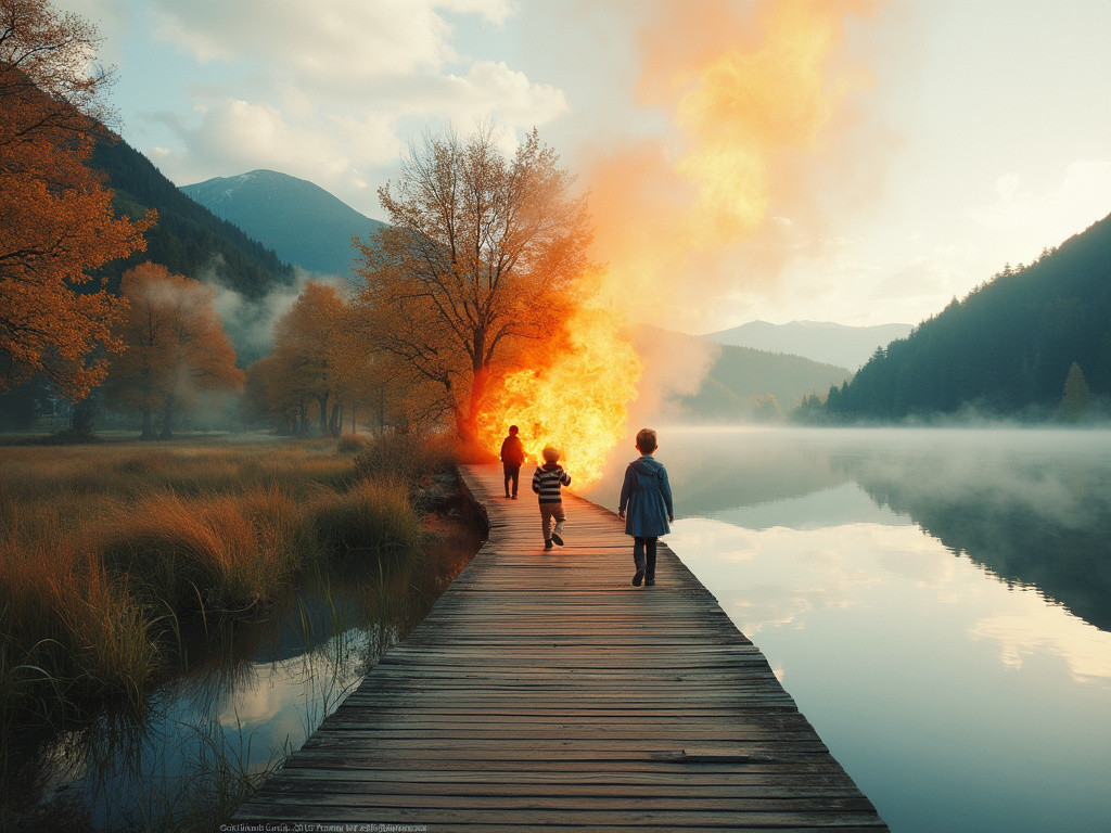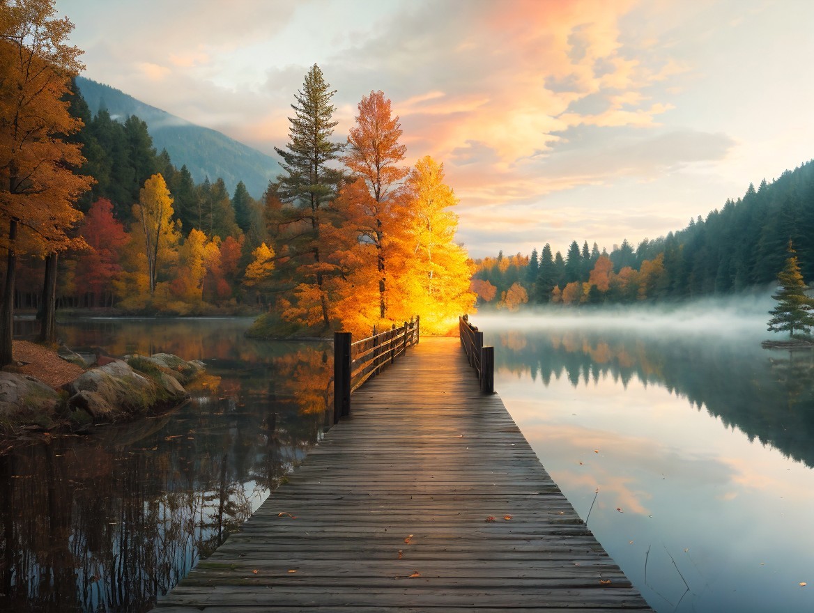 A serene autumn lake with a wooden pier, surrounded by colorful foliage and mountains under a dreamy sky.