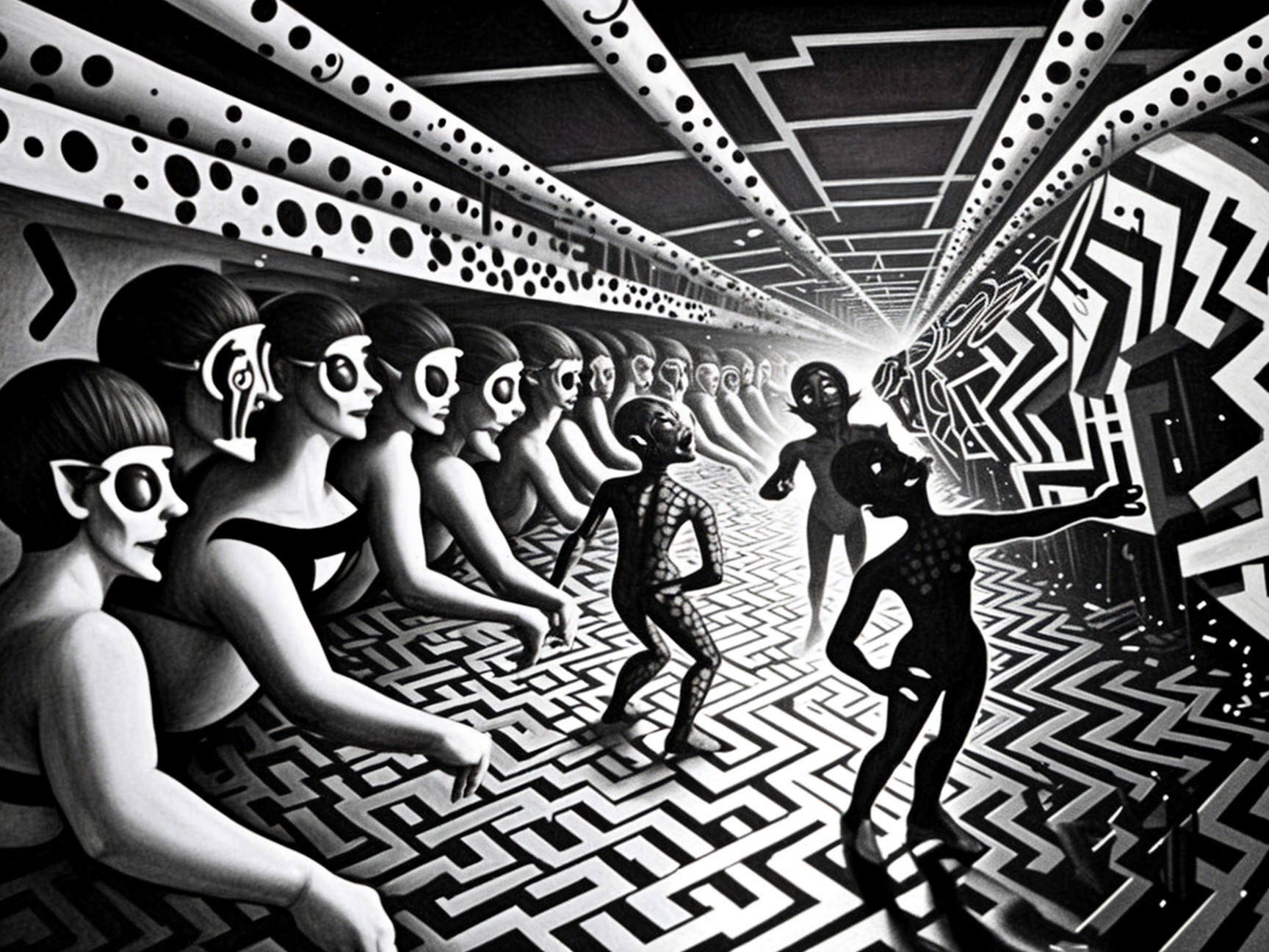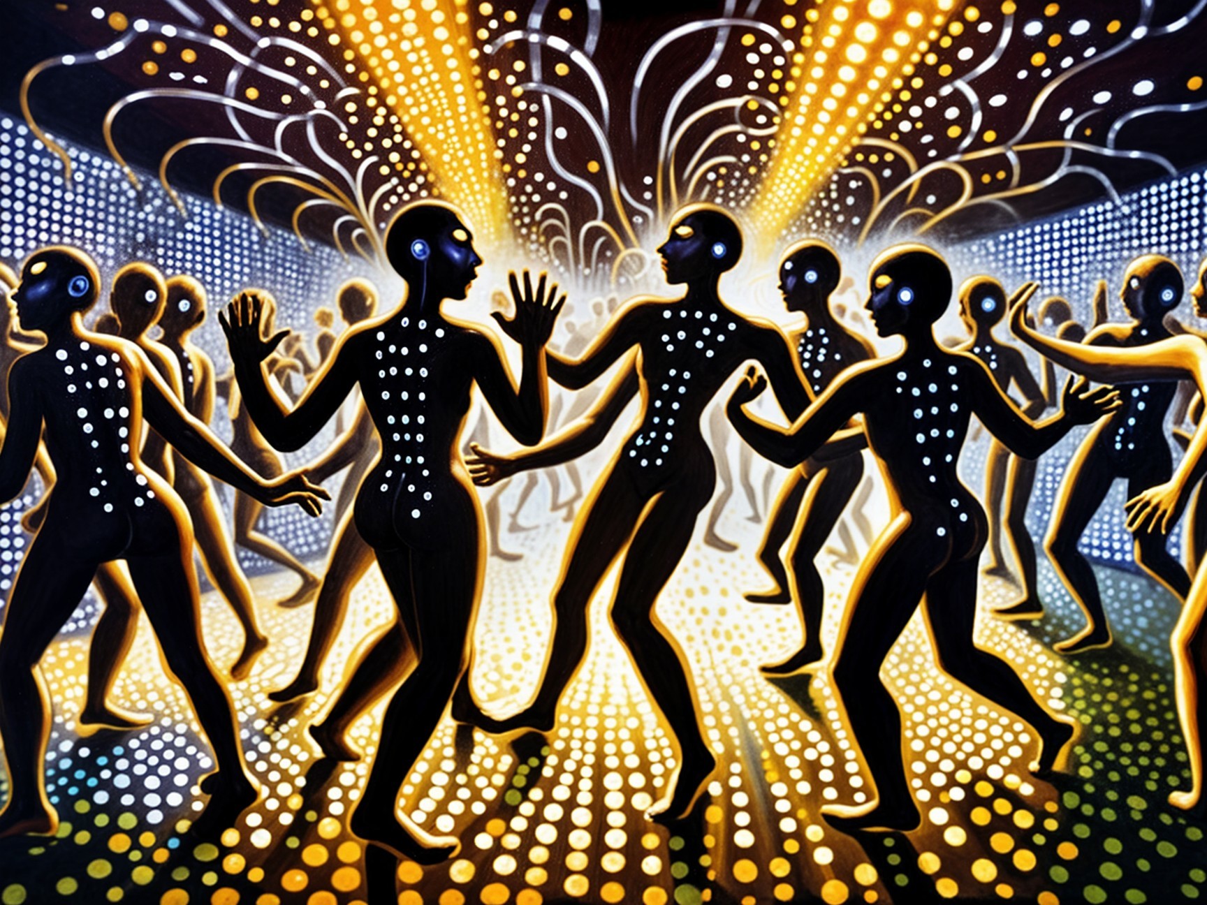 Prompt: an oppulent painting of kinky humanoid manifestations of impulsive escalating animalistic machine dmt-elves dancing orgiasticly in a techno club under the spree river in berlin. Sweat-drenched, exhausted, yet unable to let go of each other—rubbing against one another in endlessly repeating, sexually charged, pulsating movements. Trapped in the bass-heavy carpet of the night and meta-levels that know neither day nor light. Twitching bodies in the strobe light, drunk and intoxicated by unbridled lust