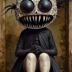 A character with oversized eyes and a spiked crown sits in a dimly lit, gothic environment. Dressed in dark clothing, she exudes an eerie yet captivating presence, framed by an atmospheric backdrop.
