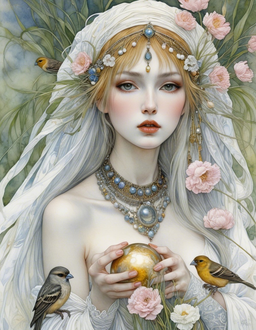 A serene woman with flowing white hair adorned in intricate jewelry stands amidst tall grass. Yellow birds perch on her shoulders, adding an enchanting touch to her ethereal presence.