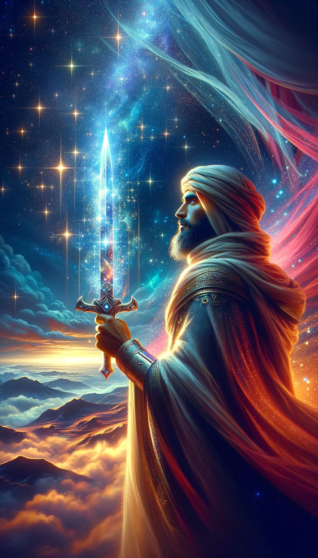 A mystical figure holds a glowing sword, standing against a backdrop of vibrant cosmic colors and clouds. Stars twinkle in the sky, enhancing the ethereal and heroic atmosphere.