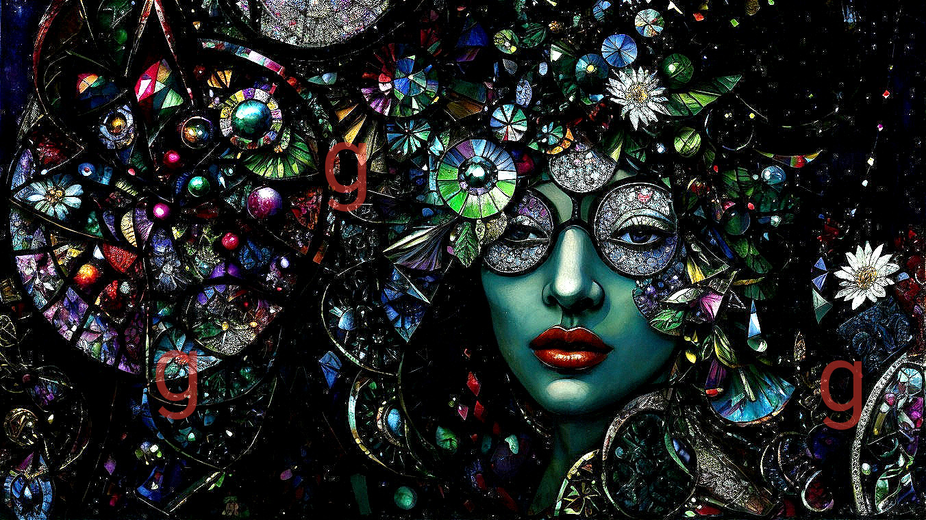 A striking portrait of a woman with turquoise skin and bold red lips, adorned with intricate floral and gemstone patterns in her hair, set against a dark, textured background.