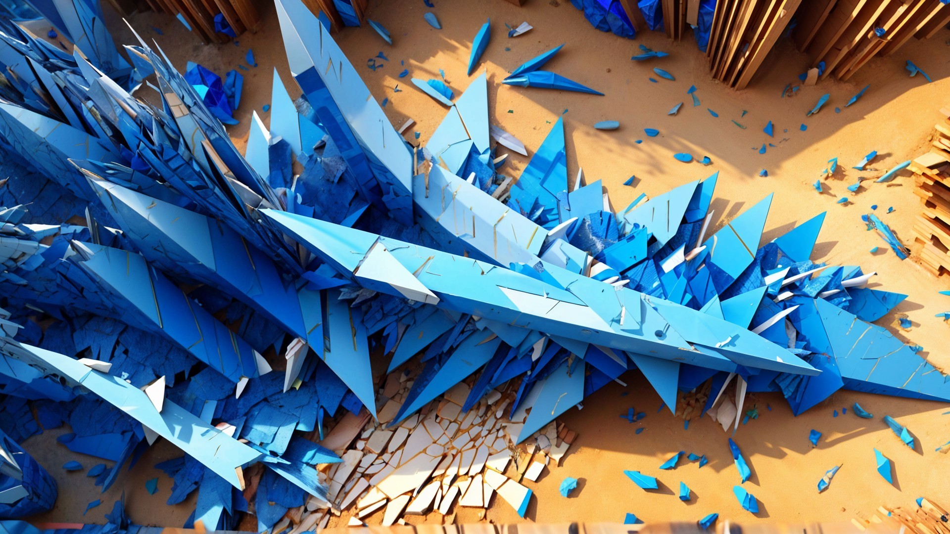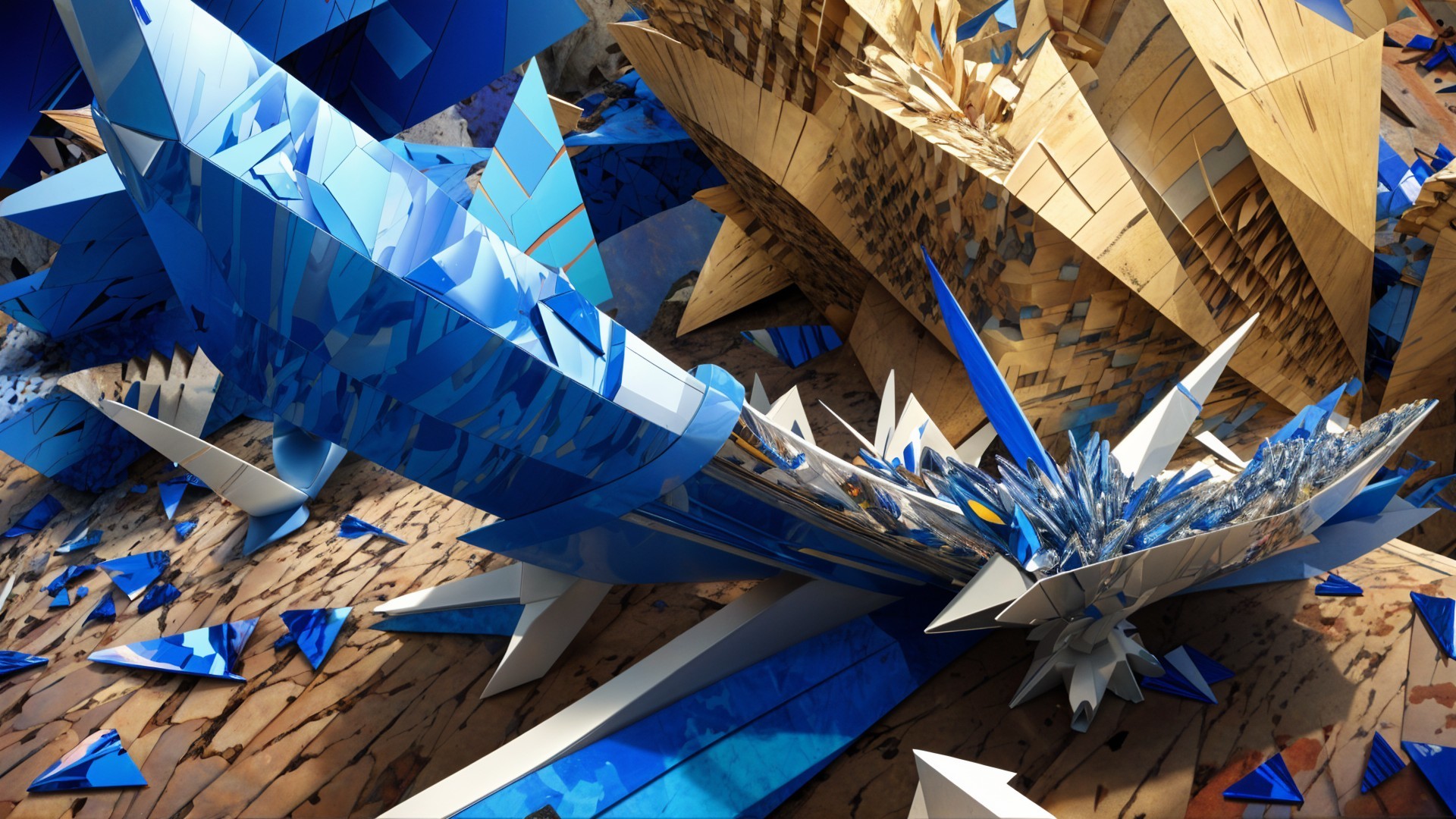 A striking cluster of blue crystalline formations emerges from a sandy surface, shimmering with light. The sharp, angular shapes create a dynamic and captivating visual.