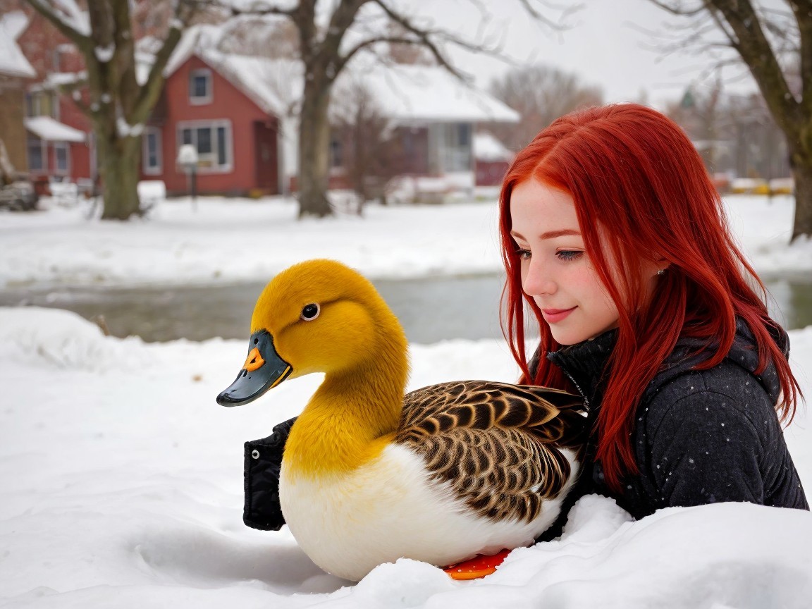 A girl with vibrant red hair sits in the snow beside a colorful duck. They are surrounded by a snowy landscape with houses in the background, creating a whimsical, serene winter scene.