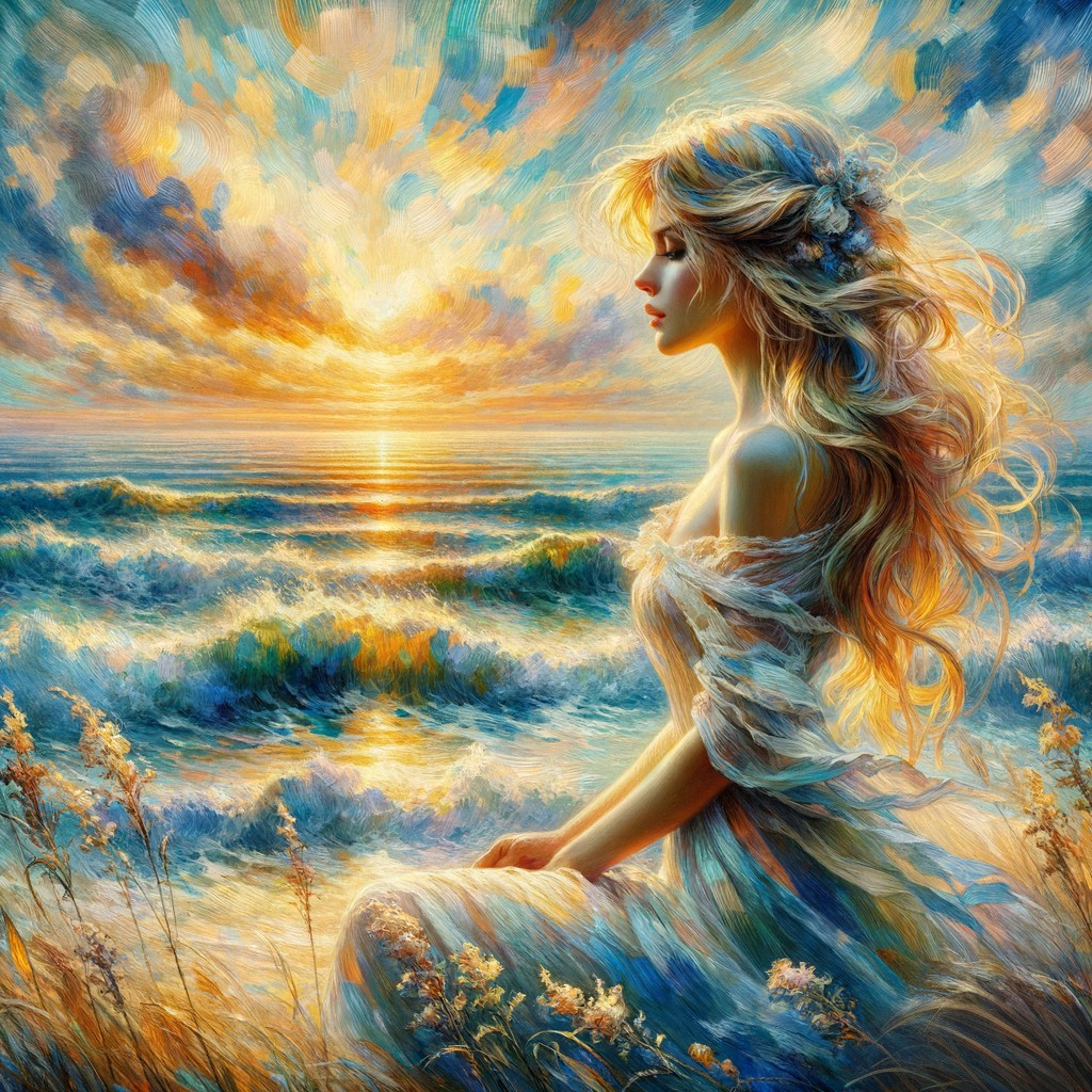 A woman sits amidst wildflowers, gazing at a vibrant sunset over a tumultuous sea, her hair flowing in harmony with the painting's vivid, swirling colors.