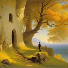 A vibrant, swirling landscape showcases a large tree with golden leaves. A man and woman stand before a quaint home, accompanied by a dog, set against rolling hills and a starry sky.