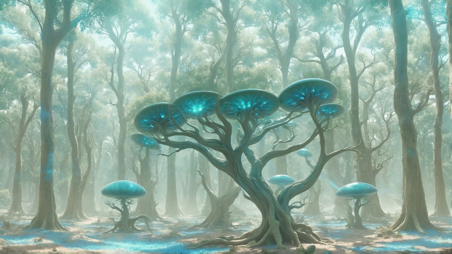 A detailed 3D rendering of a skull with intricate mechanical gears in one eye socket and artistic symbols amidst barren trees.