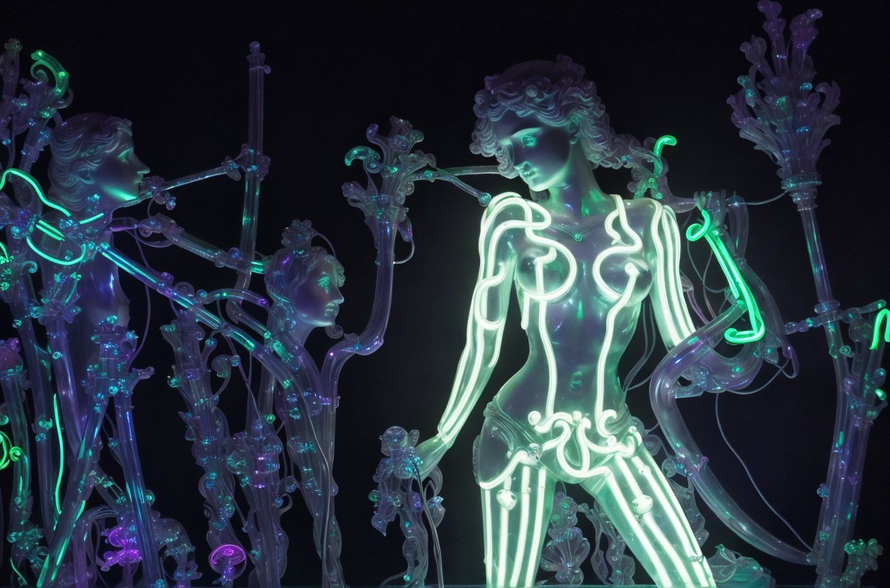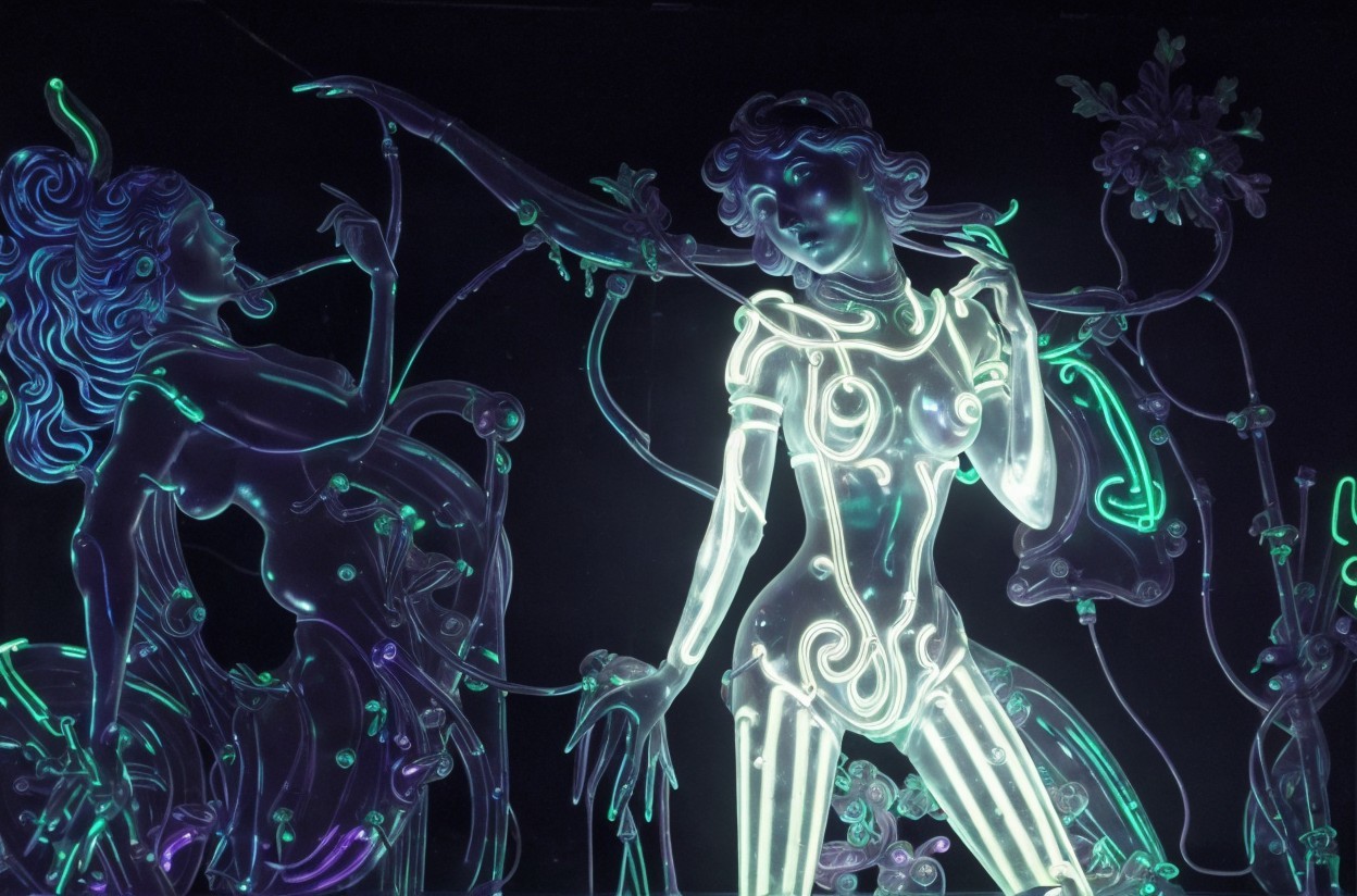 Vibrant neon sculpture of a human figure with illuminated lines, surrounded by other glowing artistic elements in a dark setting.