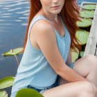 A striking steampunk-themed portrait of a red-haired woman in a sultry outfit, surrounded by gears and a scenic backdrop under a full moon, holding a colorful drink.