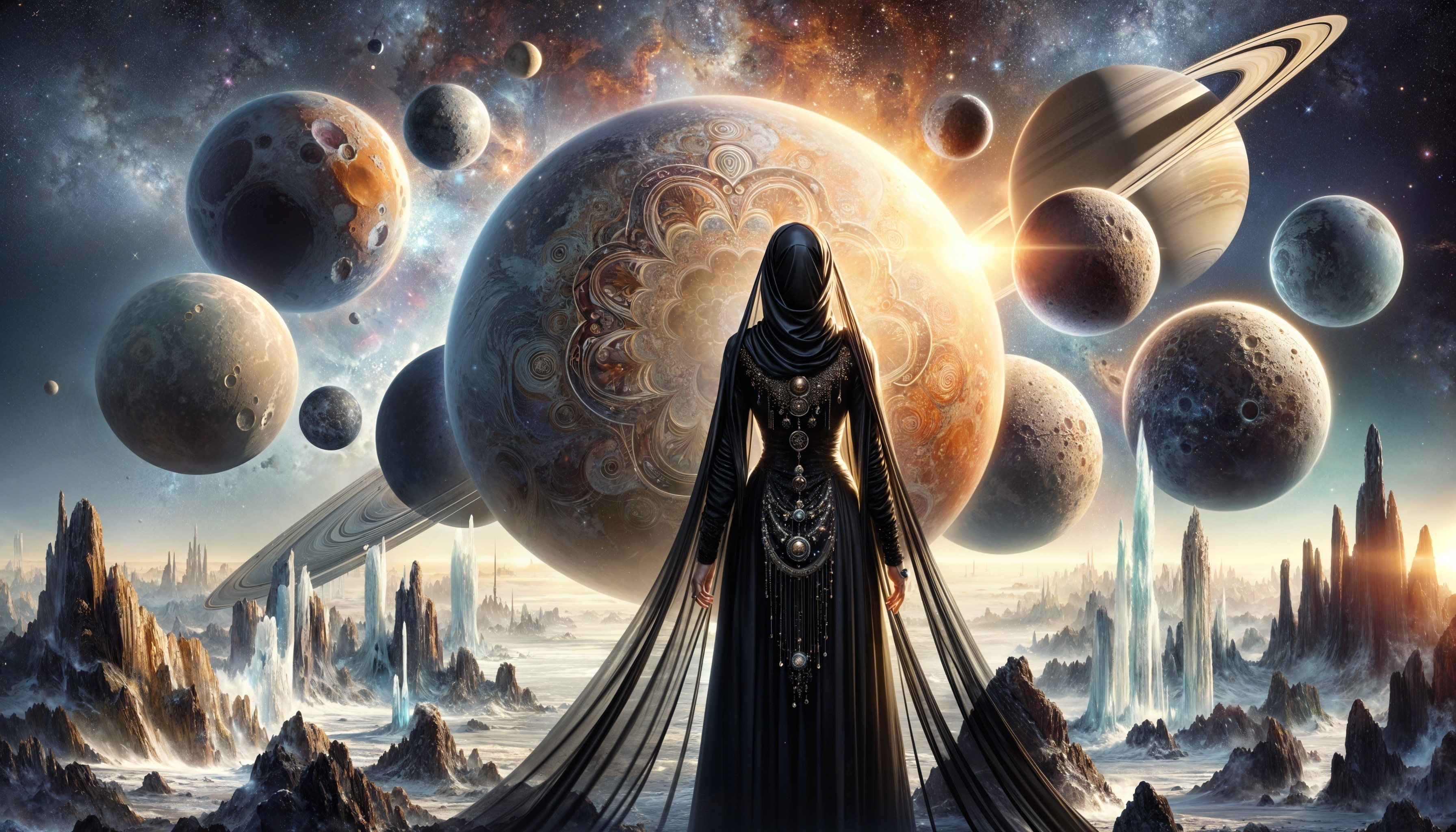 A figure in a flowing black cloak stands before a breathtaking cosmic scene, surrounded by planets and swirling galaxies. The landscape features jagged mountains, enhancing the otherworldly atmosphere.