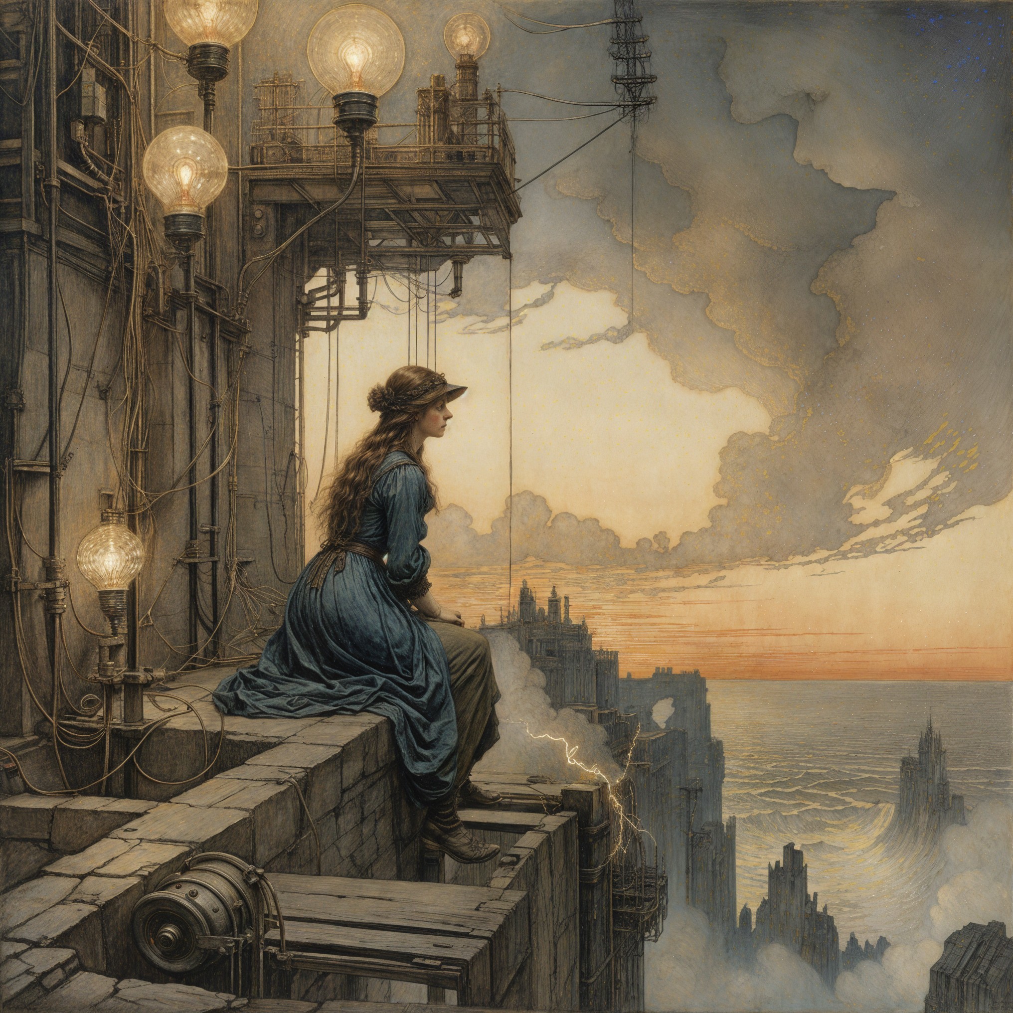 A dramatic coastal scene features intricately designed houses perched on a cliffside, with a serene sunset illuminating the sky and ocean below, creating a sense of mystery and tranquility.
